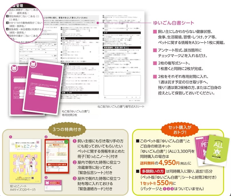 ■このペット版『ゆいごん白書®』とご本人のための終活キット『ゆいごん白書®』を同時購入の場合は、送料(430円)無料の4,950円(税込)に